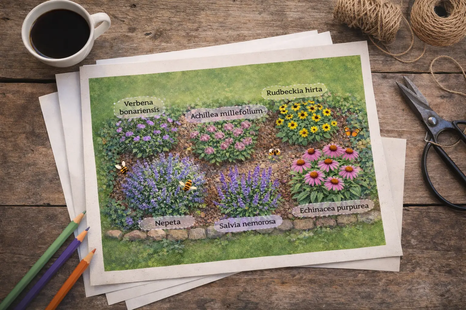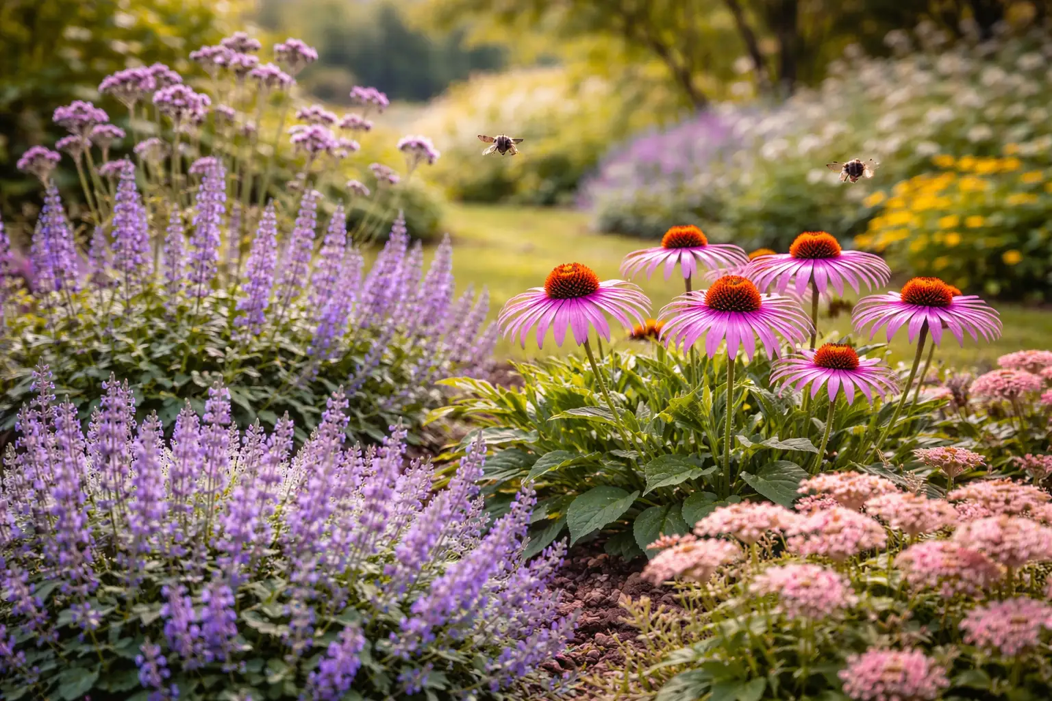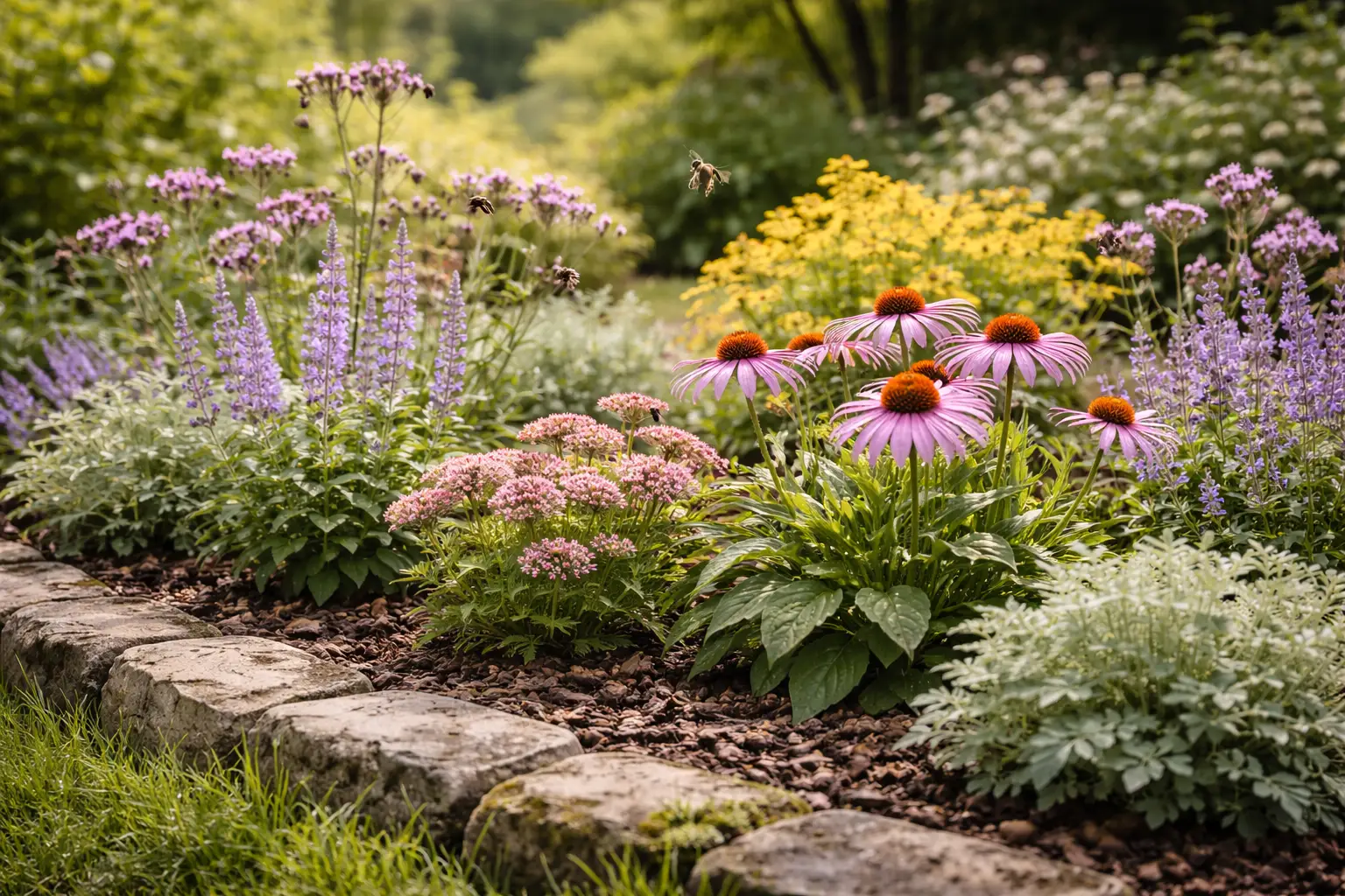 A jól működő méhbarát évelők nem önmagukban, hanem társításban mutatják meg igazi értéküket. Érdemes különböző virágzási idejű és habitusú növényeket kombinálni.