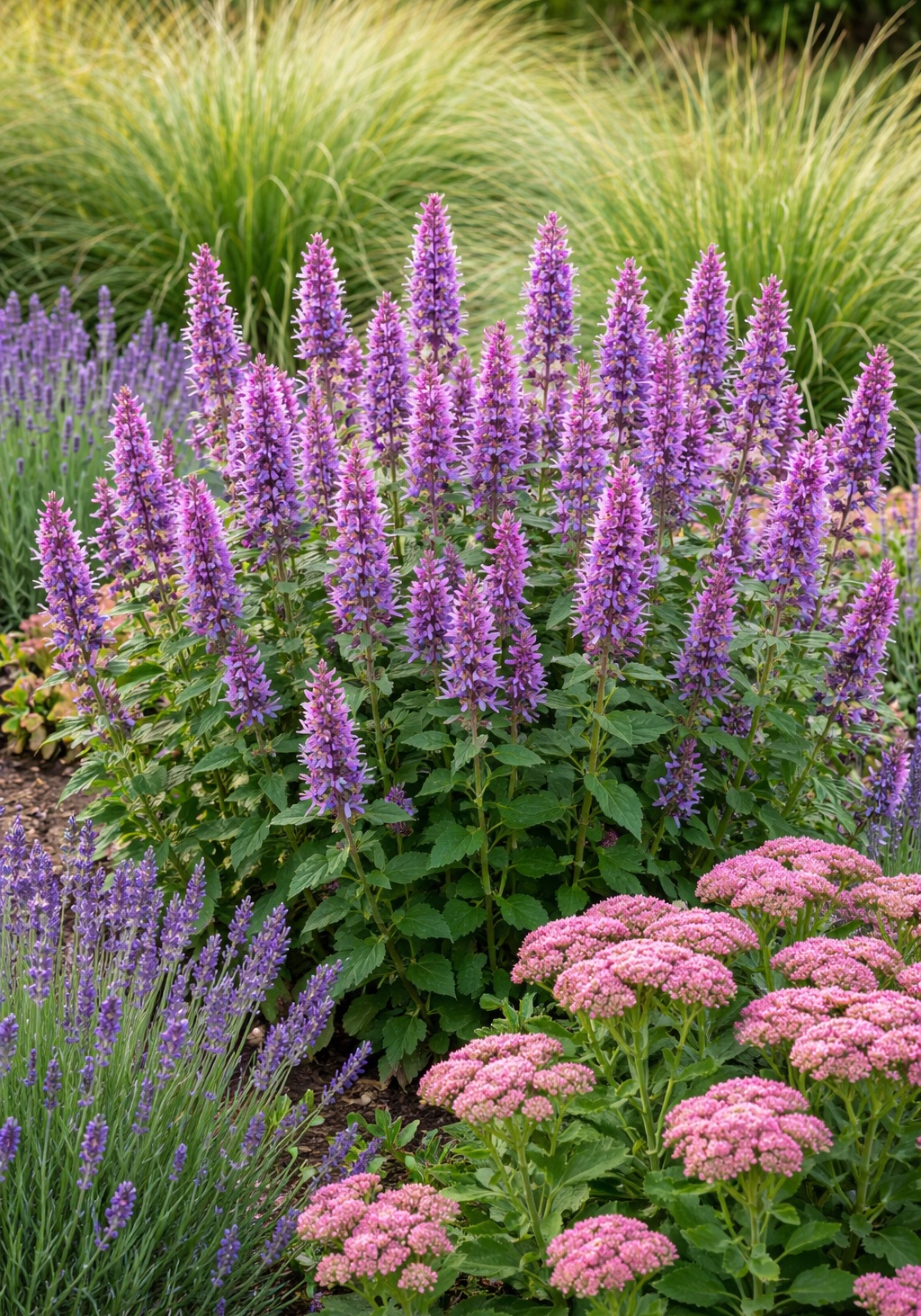 Az Agastache kiválóan társítható más szárazságtűrő évelőkkel. Különösen jól mutat levendula, díszfüvek, varjúháj (Sedum), kasvirág (Echinacea), napfényvirág vagy ligeti zsálya társaságában. Szép kontrasztot alkot sötét lombú növényekkel, például tűzesőkkel (Heuchera) vagy vörös levelű kutyatejjel is.