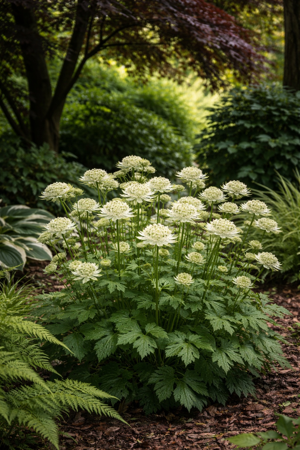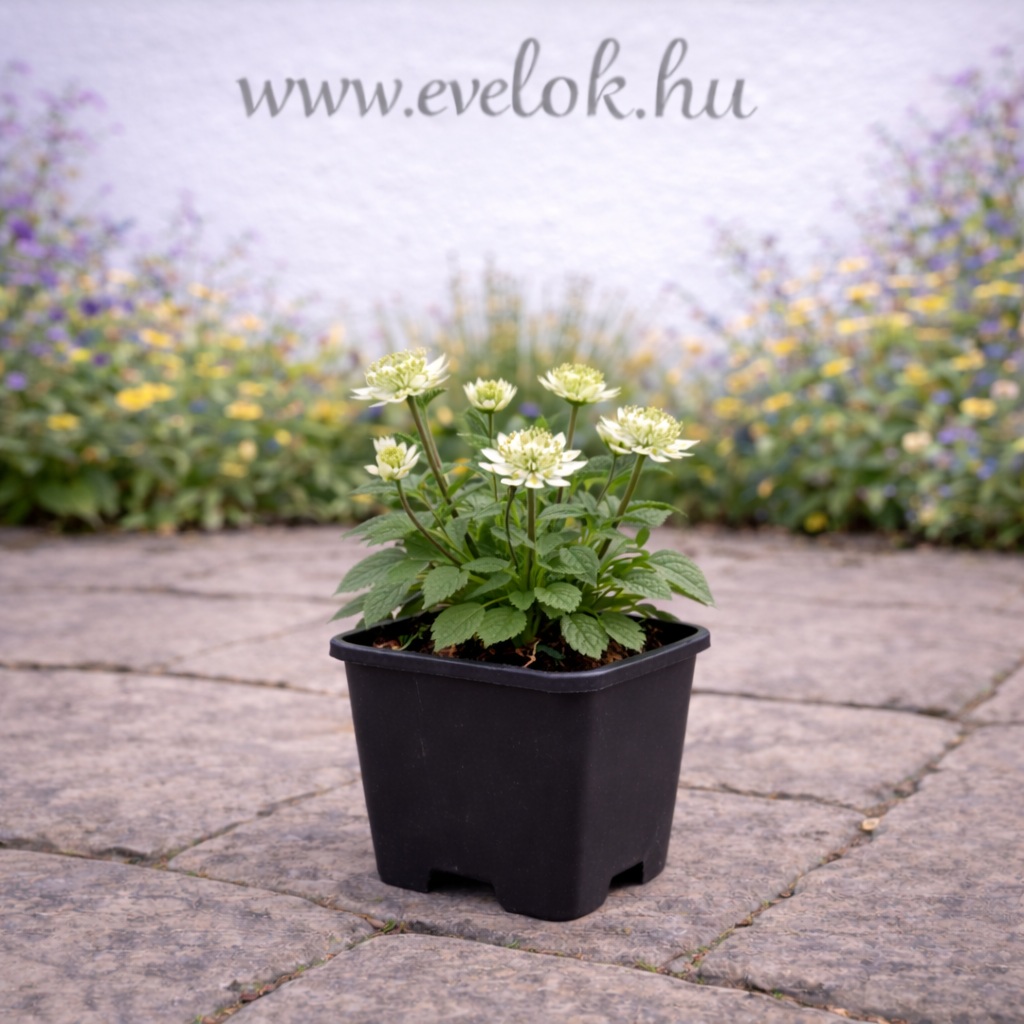 Az Astrantia major, közismert nevén a fehér völgycsillag, finoman elegáns megjelenésével a természetes hatású kertek egyik legszebb nyári évelője. Zöldesfehér árnyalatú, ernyőszerű virágai különleges formájukkal és aprólékos részleteikkel közelről is rendkívül látványosak. A virágzatok karcsú, felálló szárakon jelennek meg, a mélyen karéjos, üde zöld levelek fölé emelkedve, így légies, könnyed összhatást keltenek.