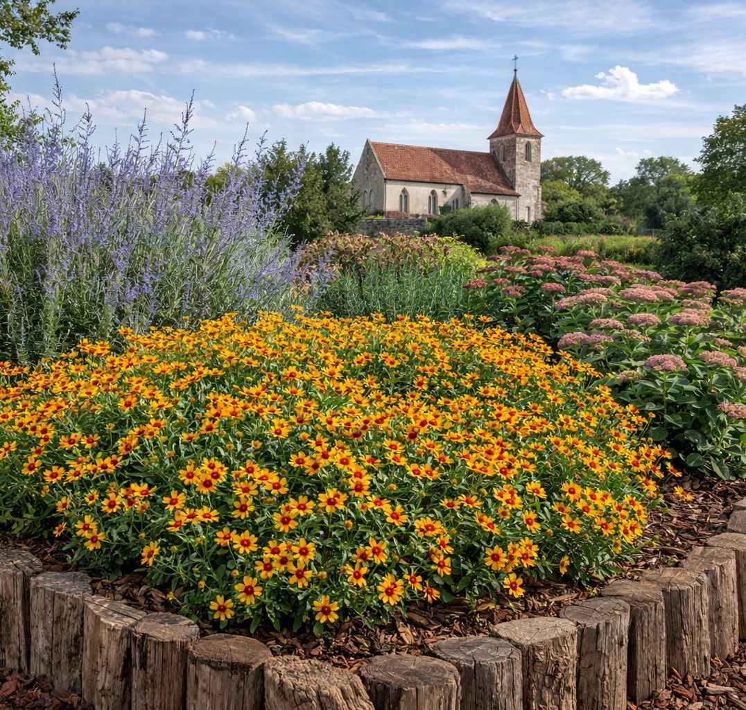 Az alacsony menyecskeszem különösen jól használható magasabb évelők elé ültetve, ahol természetes átmenetet képez az ágyás és a gyep vagy burkolt felületek között. A Coreopsis Li’l Bang ‘Daybreak’ így nemcsak színt, hanem határozott struktúrát is ad a kertnek.