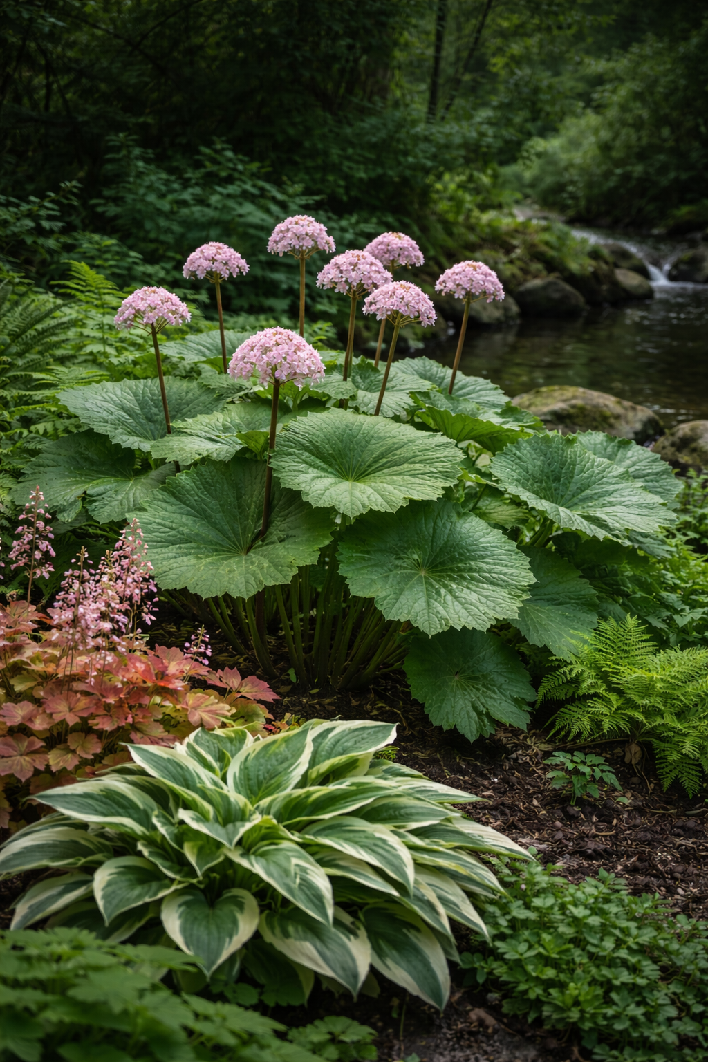 A Darmera peltata, vagyis a pajzslevél, egy igazán karakteres megjelenésű, nagy lombú évelő, amely árnyékos kertrészekben válik igazán látványossá. Tavasszal, még a levelek megjelenése előtt hozza különleges, rózsaszín virágait, később pedig hatalmas, pajzs alakú leveleivel formál erőteljes, mégis nyugodt kertképet. Kifejezetten kedveli a nyirkos, hűvös környezetet, ezért patakpartok, kerti tavak mellé vagy árnyékos évelőágyásokba ideális választás. Lombjával egész szezonban hangsúlyos szerkezeti elemet ad a kertnek.