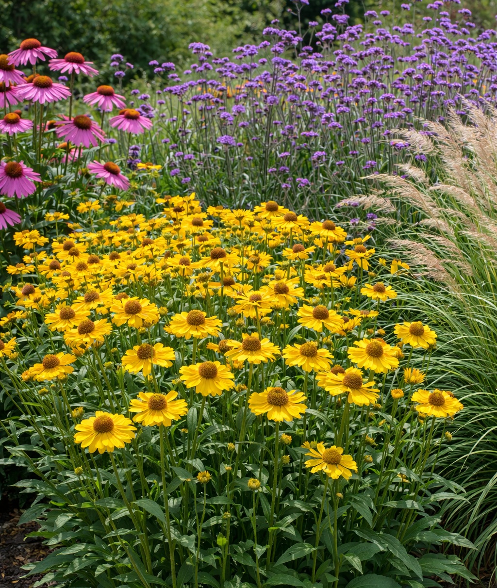 A napfényvirág élénk sárga virágai akkor érvényesülnek a legszebben, ha eltérő formájú, színű vagy lombdíszű évelők veszik körül.