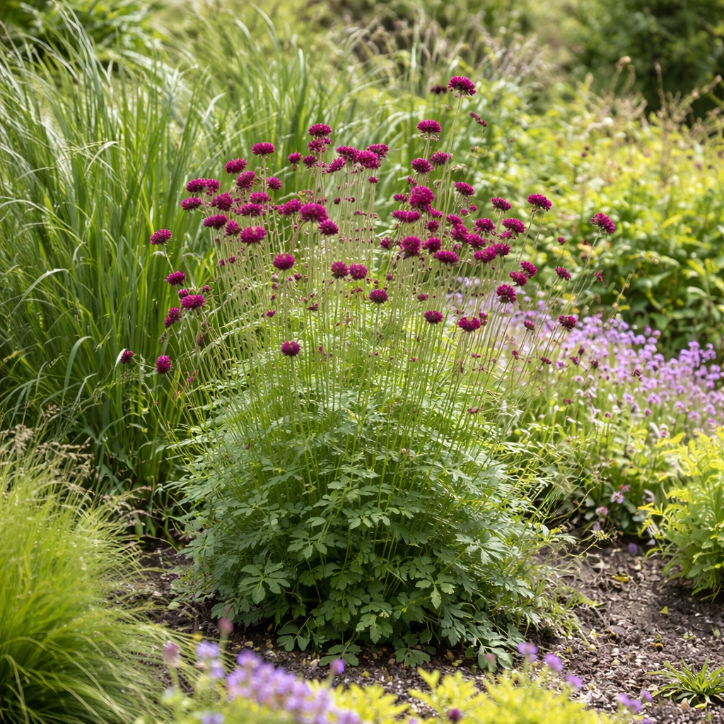 Nyári virágzása során a Knautia macedonica finoman tölti ki az évelőágyások középső vagy hátsó részét, anélkül hogy elnyomná a környező növényeket.